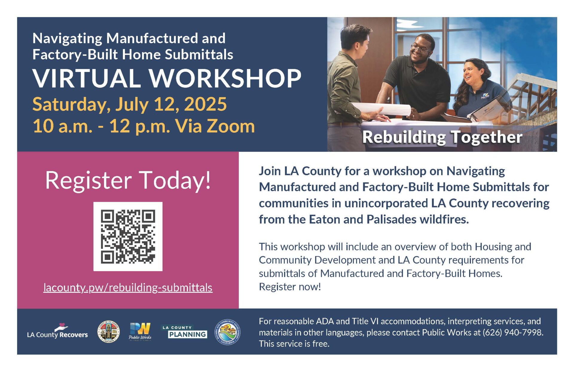 To ensure accessibility, live audio interpretation will be available in Spanish. For those unable to attend live, recordings of both the English and Spanish presentations, along with the full presentation materials, will be posted online within one week of the event at recovery.lacounty.gov/rebuilding/workshops.