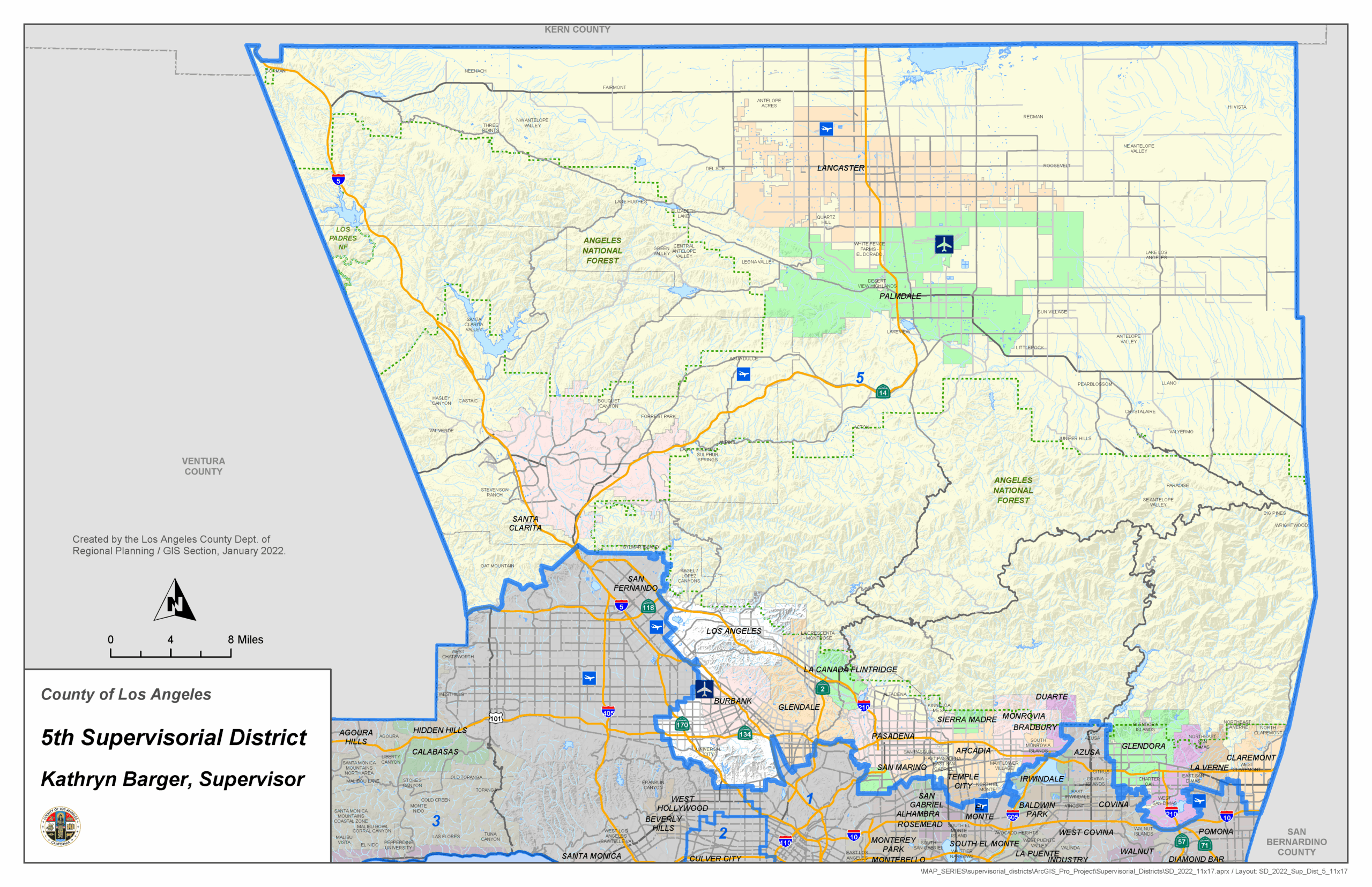 From San Bernardino County in the East, Ventura County in the West and Kern County in the North, the Fifth District spans 2,785 square miles and is larger than all the other districts combined. Home to over 2 million people, the Fifth District includes portions of 20 cities and 83 unincorporated communities in the San Gabriel, San Fernando, Crescenta, Santa Clarita and Antelope Valleys