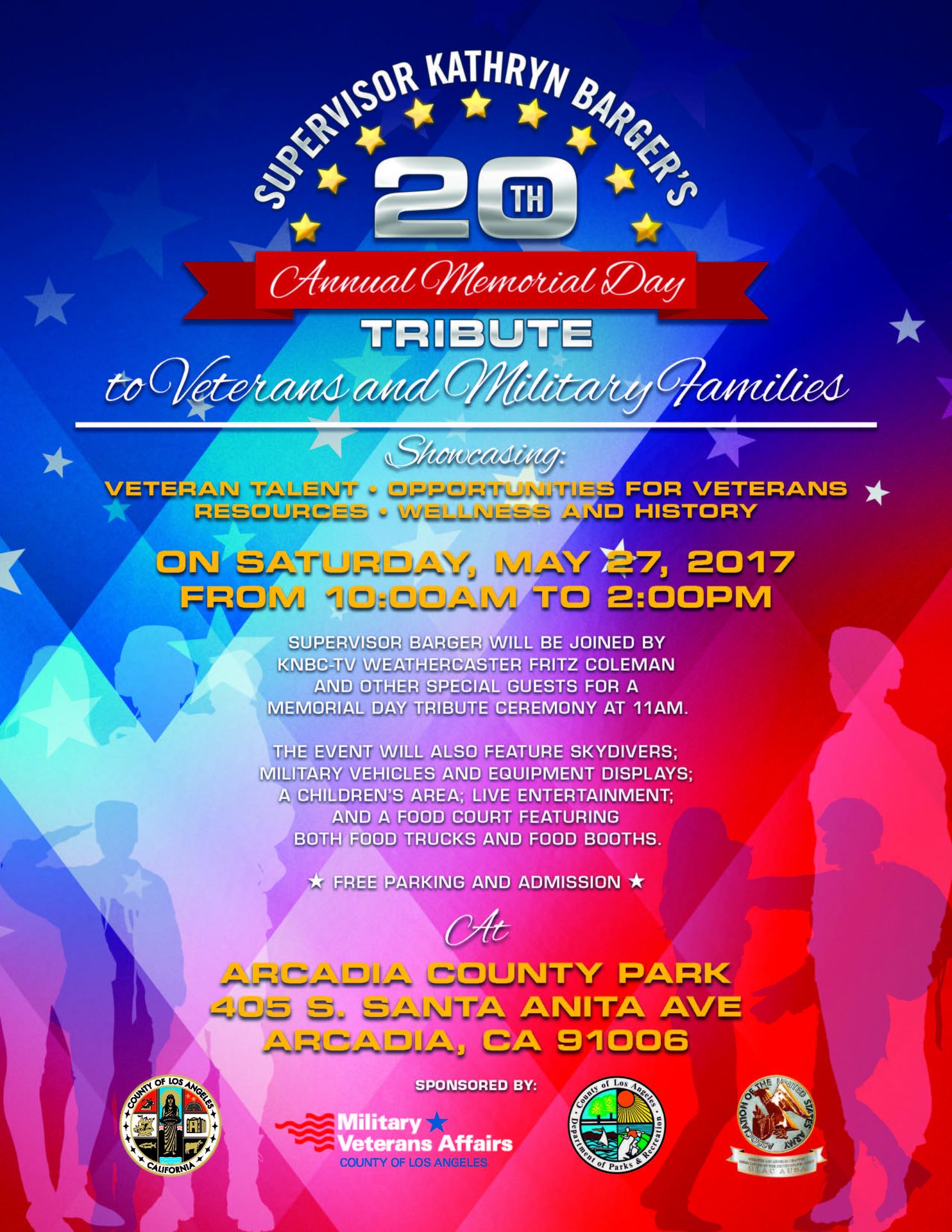 Supervisor Kathryn Barger will host the 20th Annual “Tribute to Veterans and Military Families” event this Saturday, May 27, 2017 from 10:00 am to 2:00 pm. A Memorial Day tribute will be held at 11:00 a.m. which includes recognition of the 50th anniversary of the Vietnam War and Department of Defense pinning ceremony for Vietnam veterans in the community. The family event will showcase veteran talent, military history, resources and opportunities for veterans and wellness programs.